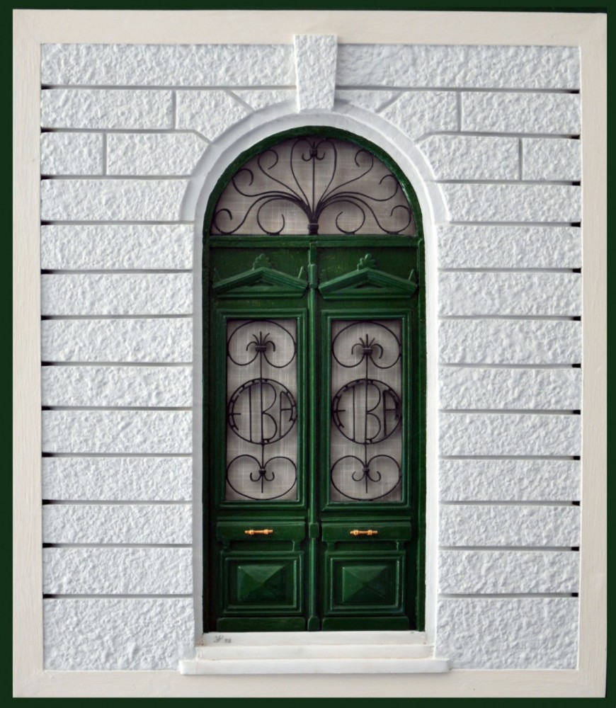 Η δική μου εκδοχή αυτής της γωνιάς έχει διαστάσεις 60 χ68 χ 4,5 cm, και ζυγίζει 16 kgr. Κτυπημένο κομμάτι πέτρας κόπηκε, για να ενσωματωθεί η ξύλινη πόρτα. Μαρμάρινα σκαλοπάτια και σιδερένια κάγκελα συμπληρώνουν τον πίνακα.