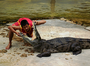 Δεν είμαι φανατικός των παραστάσεων με άγρια ζώα, διότι φαντάζομαι ότι κακοποιούνται για να μάθουν και να υπακούουν. Στην φάρμα κροκοδείλων που είμαστε, νομίζω ότι διέγνωσα και την αγωνία των παιδιών του σόου, που μας χαλογελούσαν μεν, αλλά με τον φόβο ζωγραφισμένο στα μάτια.
